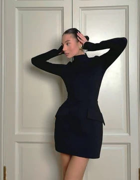 The Cherry Mini Dress features a clean high neckline, sculpted waist, and subtle flare cuffs that elevate its minimalist silhouette. Structured yet effortless, this piece is made to flatter with quiet confidence — perfect for elegant days or refined evenings.